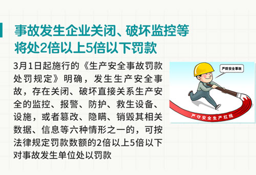 3月1日起施行的《生產(chǎn)安全事故罰款處罰規(guī)定》明確,發(fā)生生產(chǎn)安全事故,存在關(guān)閉、破壞直接關(guān)系生產(chǎn)安全的監(jiān)控、報(bào)警、防護(hù)、救生設(shè)備、設(shè)施,或者篡改、隱瞞、銷毀其相關(guān)數(shù)據(jù)、信息等六種情形之一的,可按法律規(guī)定罰款數(shù)額的2倍以上5倍以下對事故發(fā)生單位處以罰款...